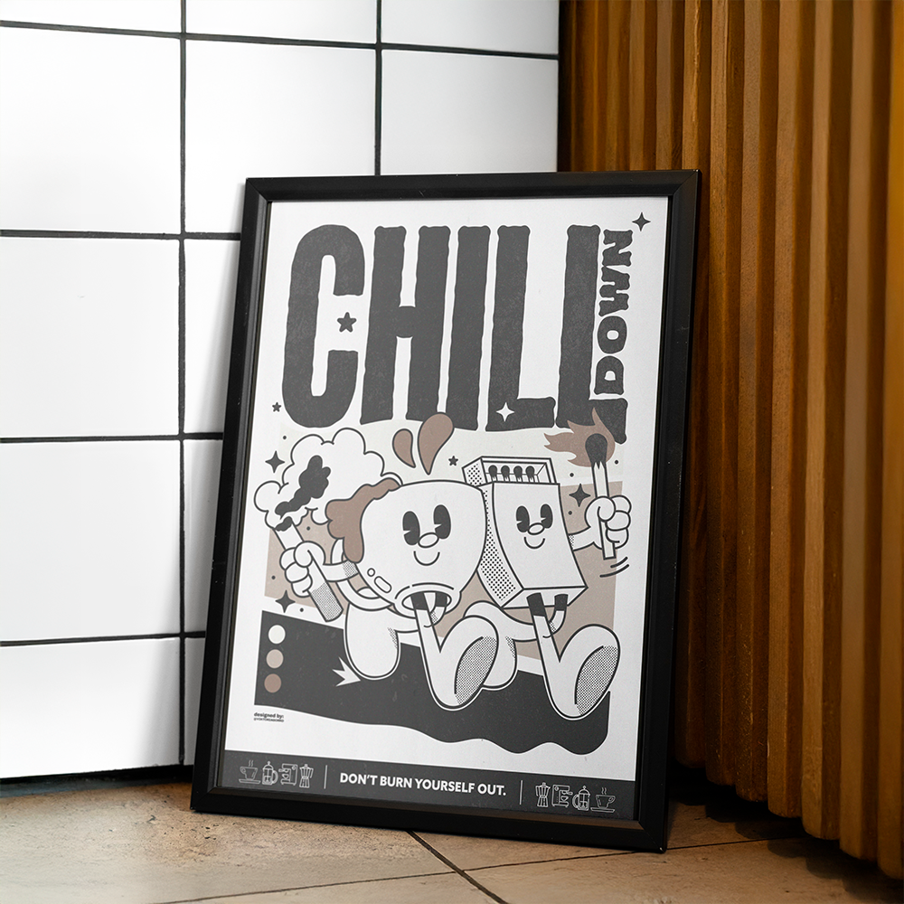 Plakat „CHILL DOWN” to coś dla kawoszy-palaczy. Bo w końcu kawusia i papierosek to iconic duo, co nie?