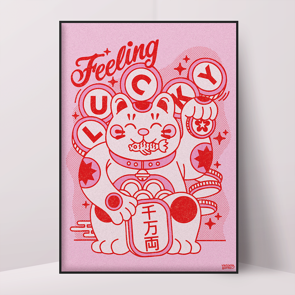 Plakat „FEELING LUCKY” to lekko kasynowa wersja klasycznego Maneki Neko.