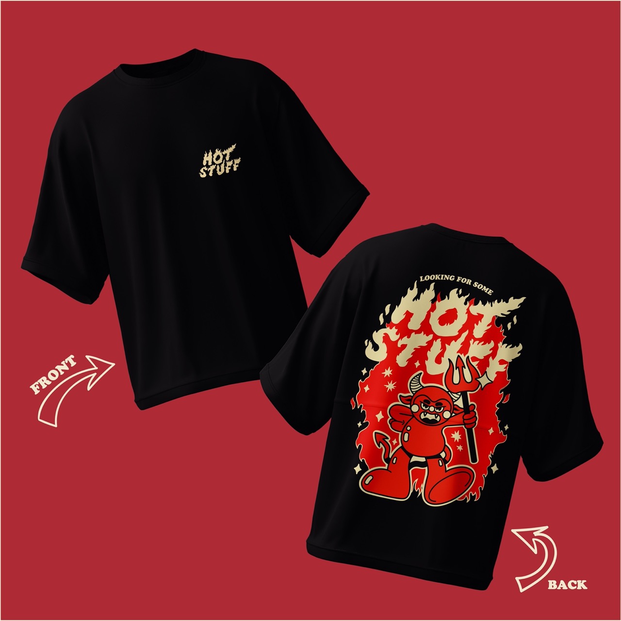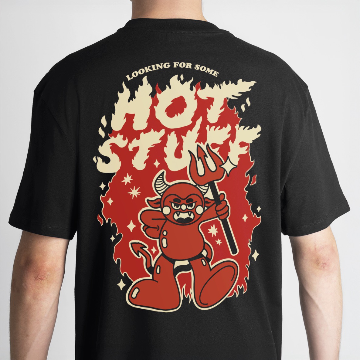 Koszulka „HOT STUFF” to najgorętszy t-shirt tego sezonu! Serio, nie zmyślam! Boxy, oversize, drukowany metodą sitodruku z gumiastym wykończeniem. To taka koszulka, że za 20 lat Twoje dzieci będą się o nią bić. Mocna, energetyczna, dla prawdziwych diabełków. Ma feeling, jakby się jeździło na harleyu albo chodziło na koncerty rockowe.